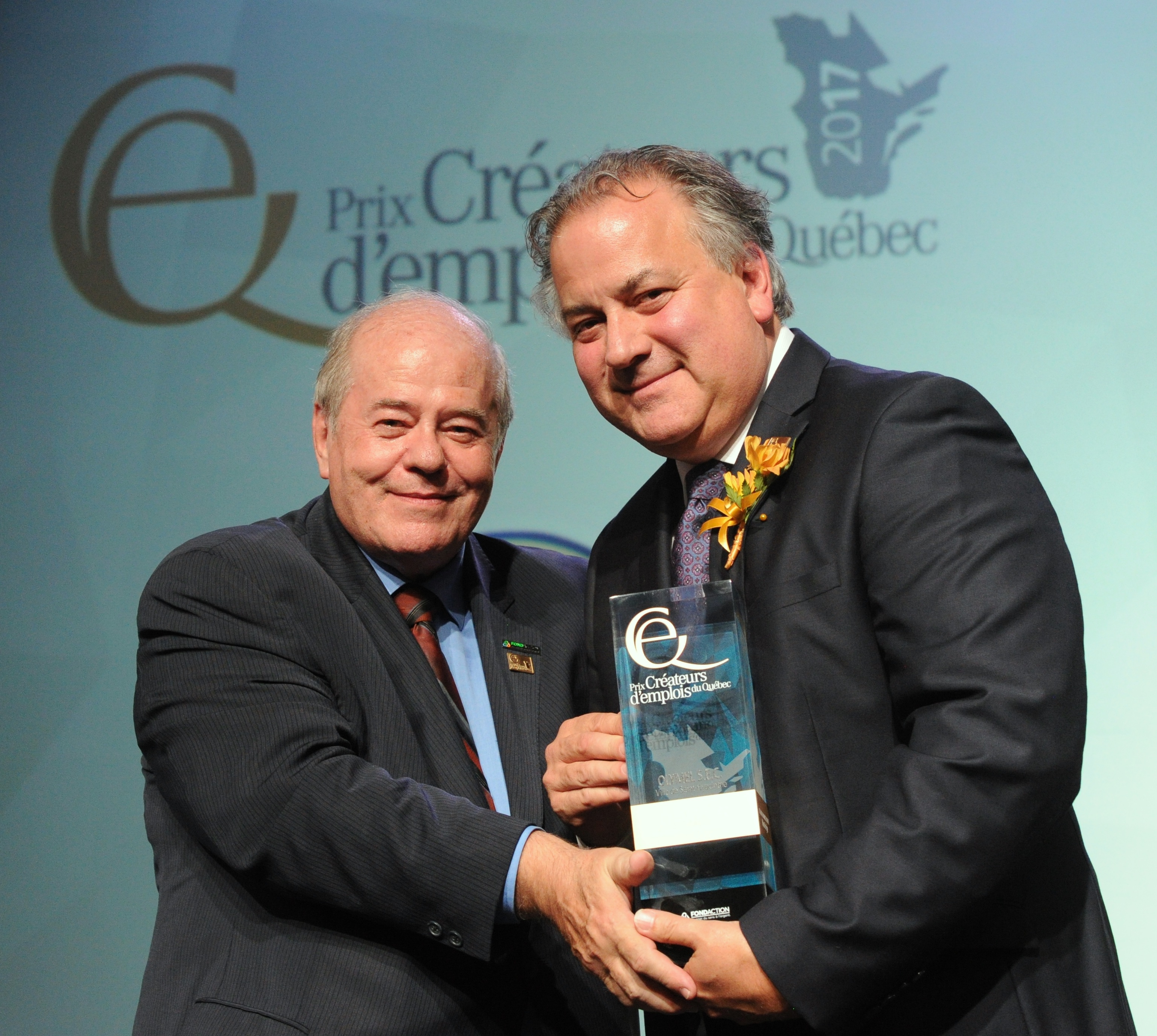Léopold Beaulieu, président-directeur général de Fondaction et Paul Beauchamp, premier vice-président d’Olymel S.E.C, entreprise récipiendaire du prix Champion du Prix Créateurs d’emplois du Québec pour la région de la Montérégie. |
